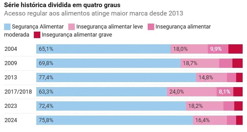 🍽️ Quais as descobertas? No ano passado, 6,4 milhões de brasileiros ainda viviam sem ter comida suficiente — uma melhora relevante, já que o número representa 2,2 milhões de pessoas a menos do que em 2023.