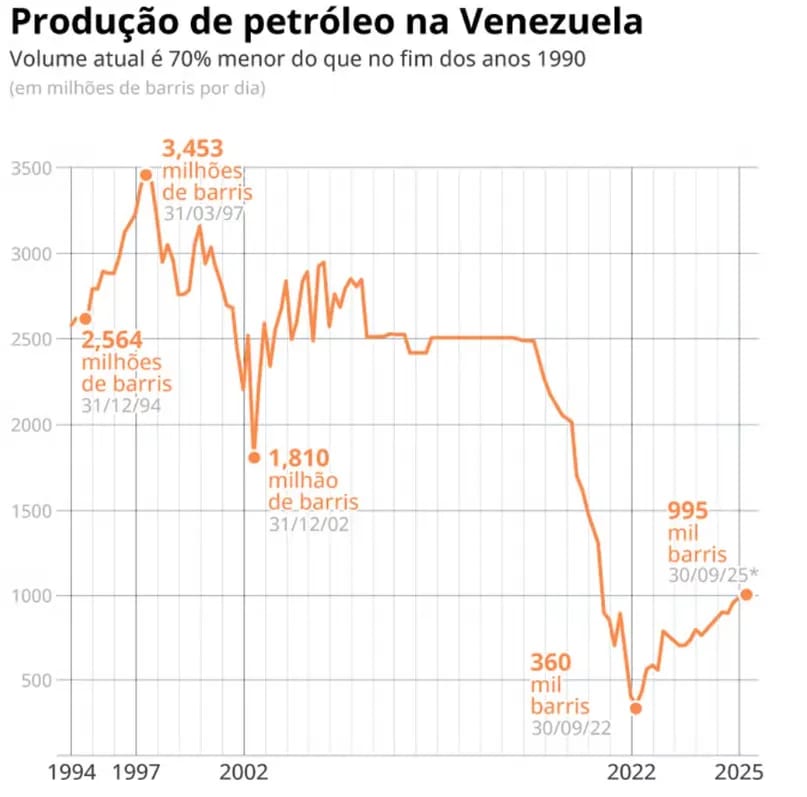 Para se ter ideia, na década de 1970, a Venezuela chegava a produzir quase 4 milhões de barris por dia — não por acaso, o país era mais rico que a Itália, e a capital, Caracas, era comparada a Paris.