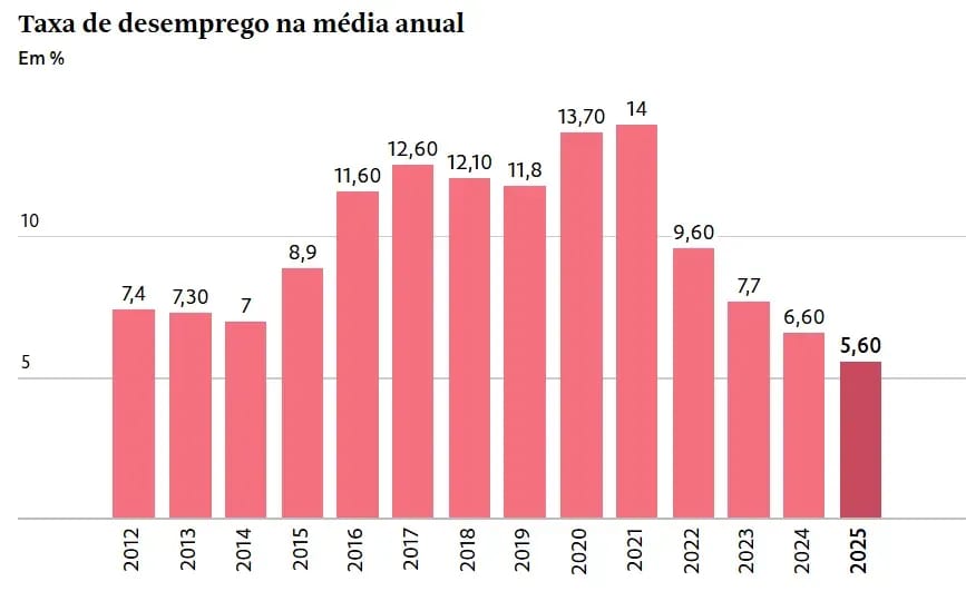 No último trimestre de 2025, a taxa ficou em 5,1%, fazendo com que a média anual fechasse em 5,6%.