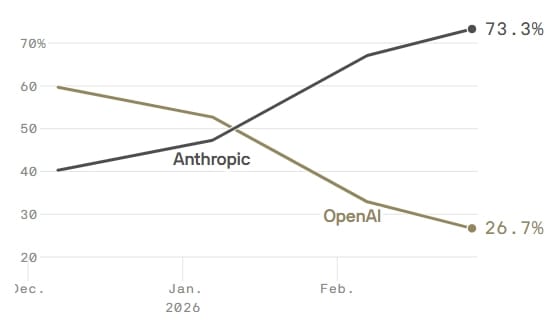 Há 10 semanas, a disputa com a OpenAI estava em 50/50, enquanto, em dezembro, a empresa de Sam Altman liderava com 60% da nova receita.