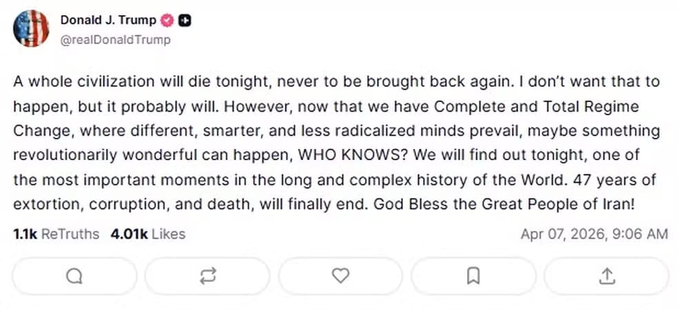 🇺🇸🗣️ Acaba em algumas horas: Antes de prazo para reabertura de Ormuz, Trump ameaça Irã dizendo que “uma civilização inteira irã morrer esta noite”